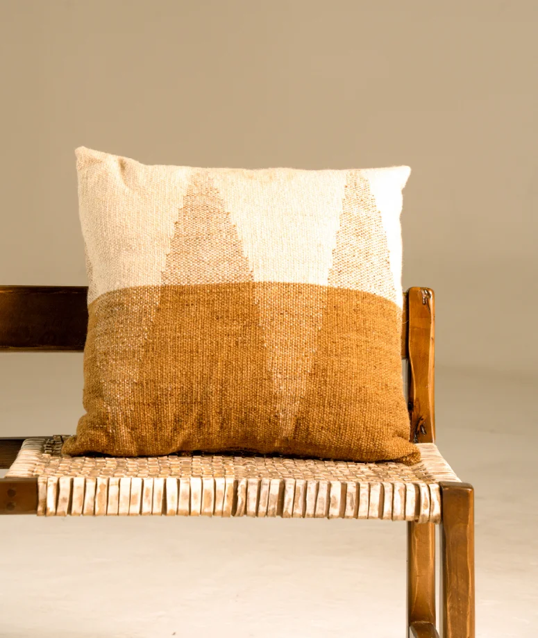 Handcrafted cushion made of 100% natural sheep wool, woven on a loom with a simple line design that evokes the profiles of the landscape.